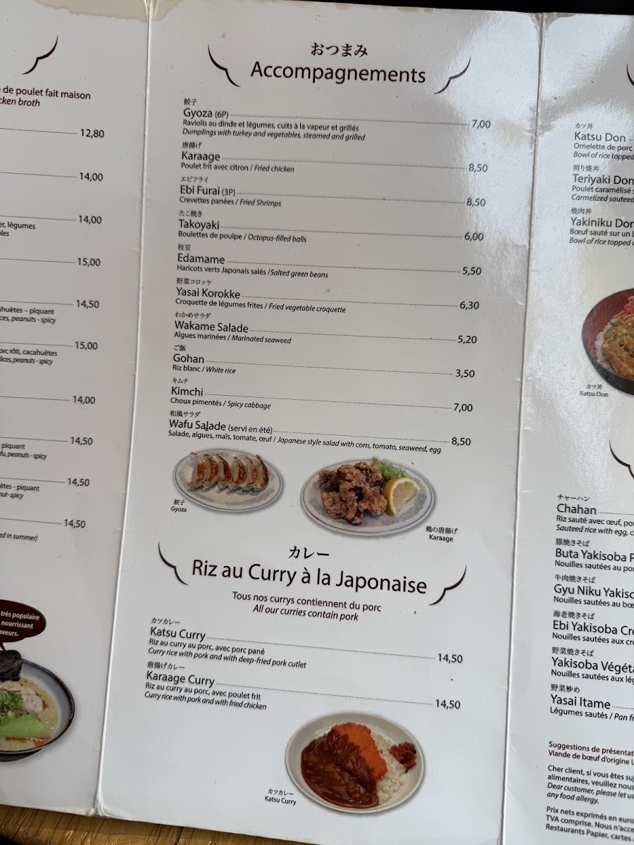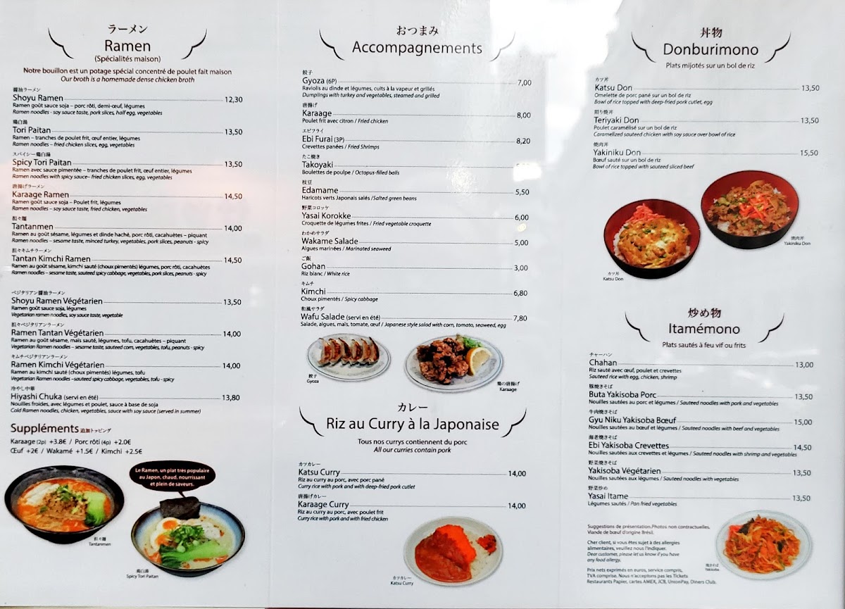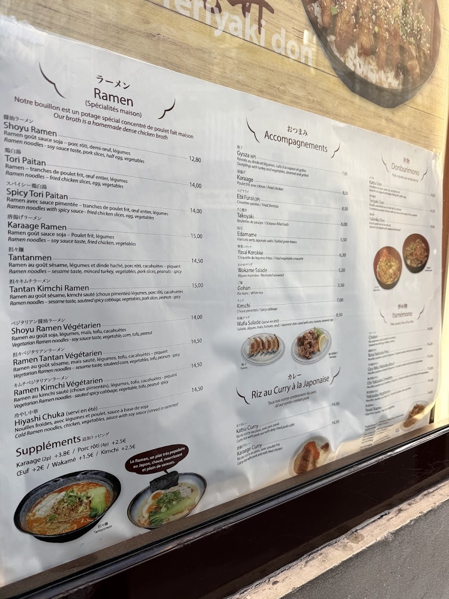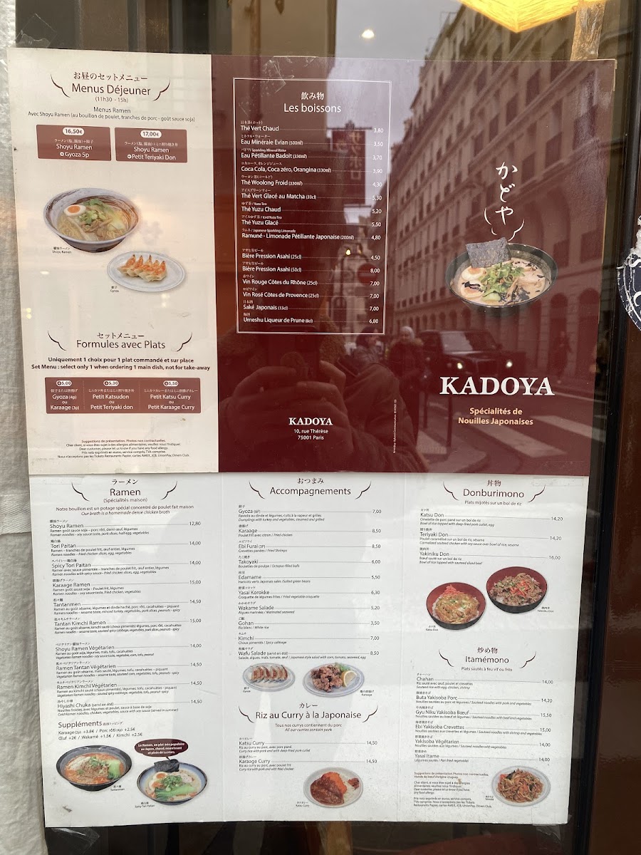 Kadoya offers a menu that gently bridges everyday comfort with authentic Japanese flavors, presenting a selection that feels both familiar and inviting. The menu centers around hearty dishes like steaming bowls of shoyu ramen and spicy tori paitan, alongside satisfying small plates such as gyoza and takoyaki croquettes. Whether you’re stopping in for a quick lunch or settling in for a relaxed dinner, the variety of ramen, donburimono rice bowls, and stir-fried noodles provide comforting choices that pair well with the casual, bustling atmosphere of this Parisian neighborhood spot.